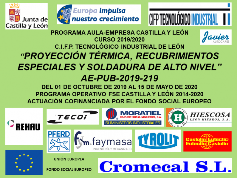 "PROYECCIÓN TÉRMICA, RECUBRIMIENTOS ESPECIALES Y SOLDADURA DE ALTO NIVEL" ES UN PROYECTO AULA EMPRESA, COFINANCIADO POR EL FONDO SOCIAL EUROPEO, QUE SE CONCIBE COMO UN COMPLEMENTO DE FORMACIÓN QUE PERMITIRÁ CONOCER NUEVAS DISCIPLINAS Y APLICACIONES DEL SECTOR. LA COLABORACIÓN CON LAS EMPRESAS PROPORCIONA VALIOSA FORMACIÓN ESPECÍFICA, ASÍ COMO INFORMACIÓN SOBRE EL MERCADO, LOS FLUJOS Y DINÁMICAS DE TRABAJO DE LAS EMPRESAS, FUTURAS NECESIDADES, FACILITA PARA ESTRECHAR VÍNCULOS ENTRE EMPRESA Y C.I.F.P. TECNOLÓGICO INDUSTRIAL DE LEÓN.
